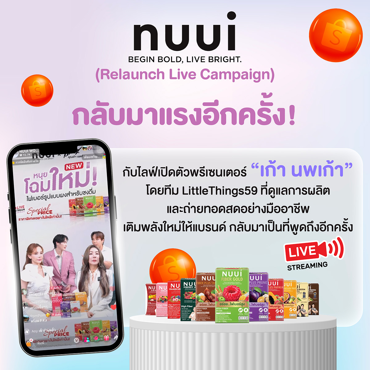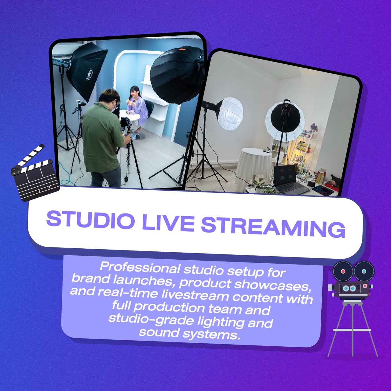 สตูดิโอถ่ายทอดสดครบวงจรสำหรับแบรนด์ ให้บริการสตูดิโอพร้อมทีมโปรดักชันมืออาชีพ เหมาะสำหรับการเปิดตัวสินค้า การขายแบบไลฟ์ และคอนเทนต์เรียลไทม์คุณภาพระดับสตูดิโอ