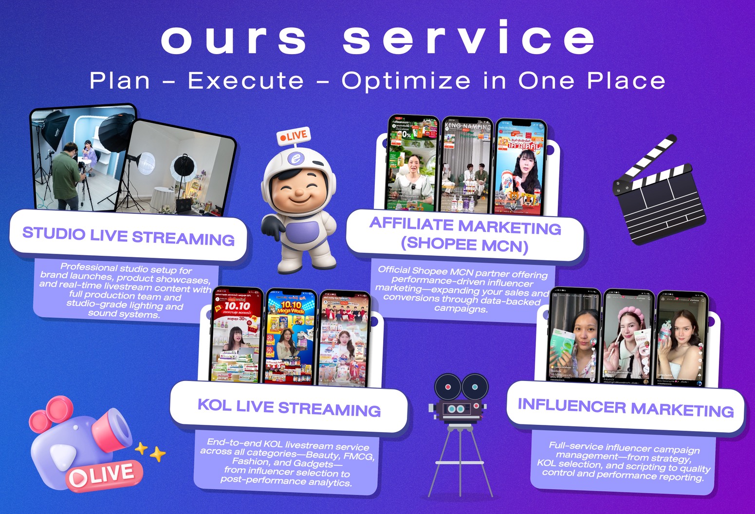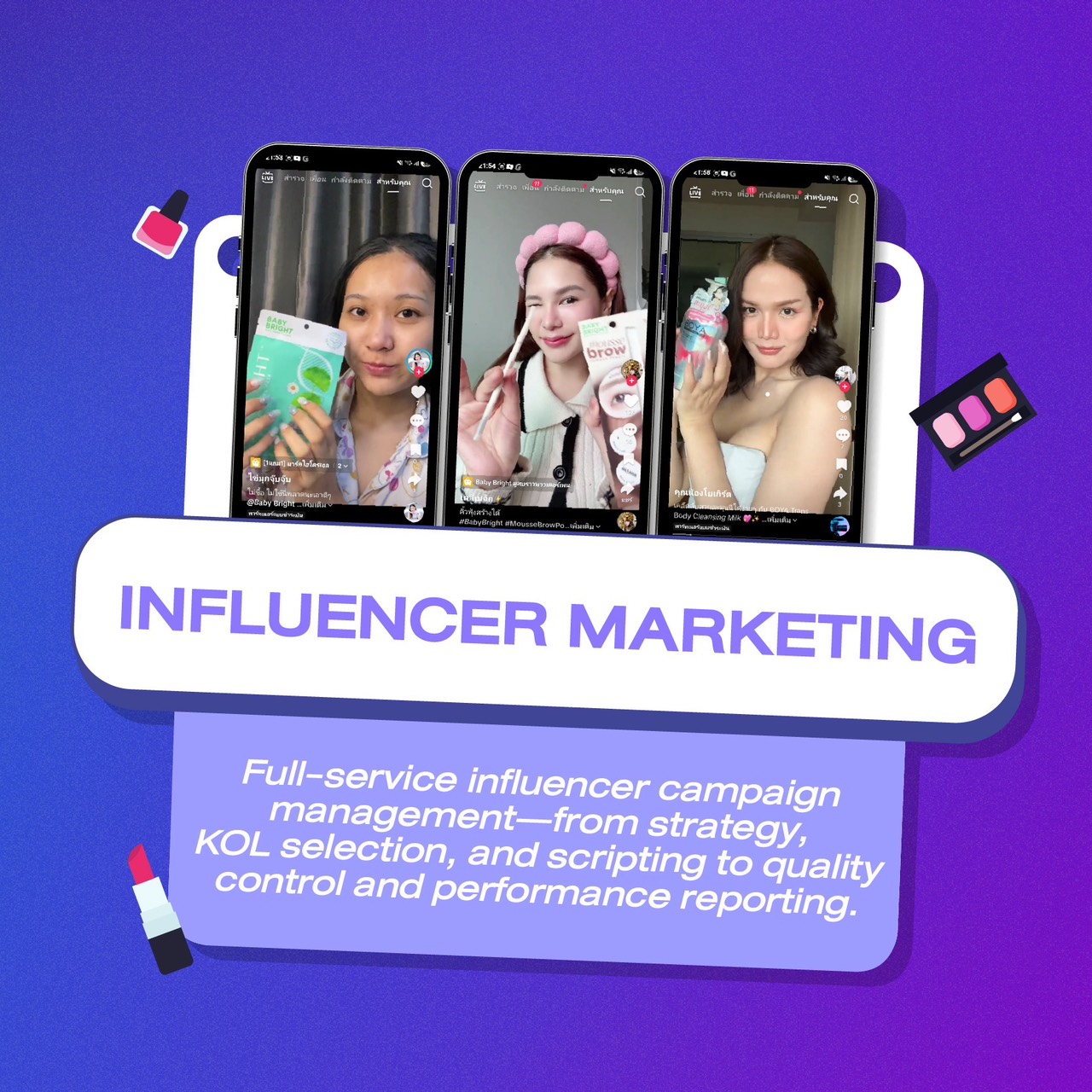 บริหารแคมเปญรีวิวแบบครบวงจรสำหรับแบรนด์ ตั้งแต่การวางแผน เลือก KOL เขียนสคริปต์ ไปจนถึงรายงานผลจริง เพื่อให้ทุกคอนเทนต์สร้างผลลัพธ์ที่วัดได้จริง