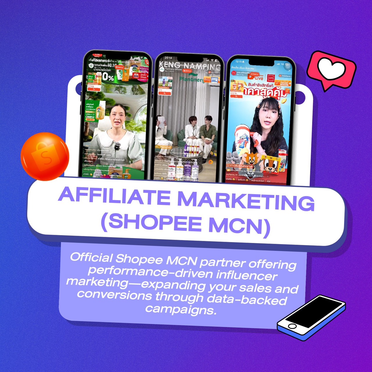ขยายยอดขายผ่านระบบ Shopee MCN อย่างเป็นทางการ บริหารอินฟลูเอนเซอร์ด้วยข้อมูลจริงและกลยุทธ์การตลาดที่วัดผลได้ เพิ่ม Conversion ให้แบรนด์ด้วยแคมเปญแบบ Performance-driven
